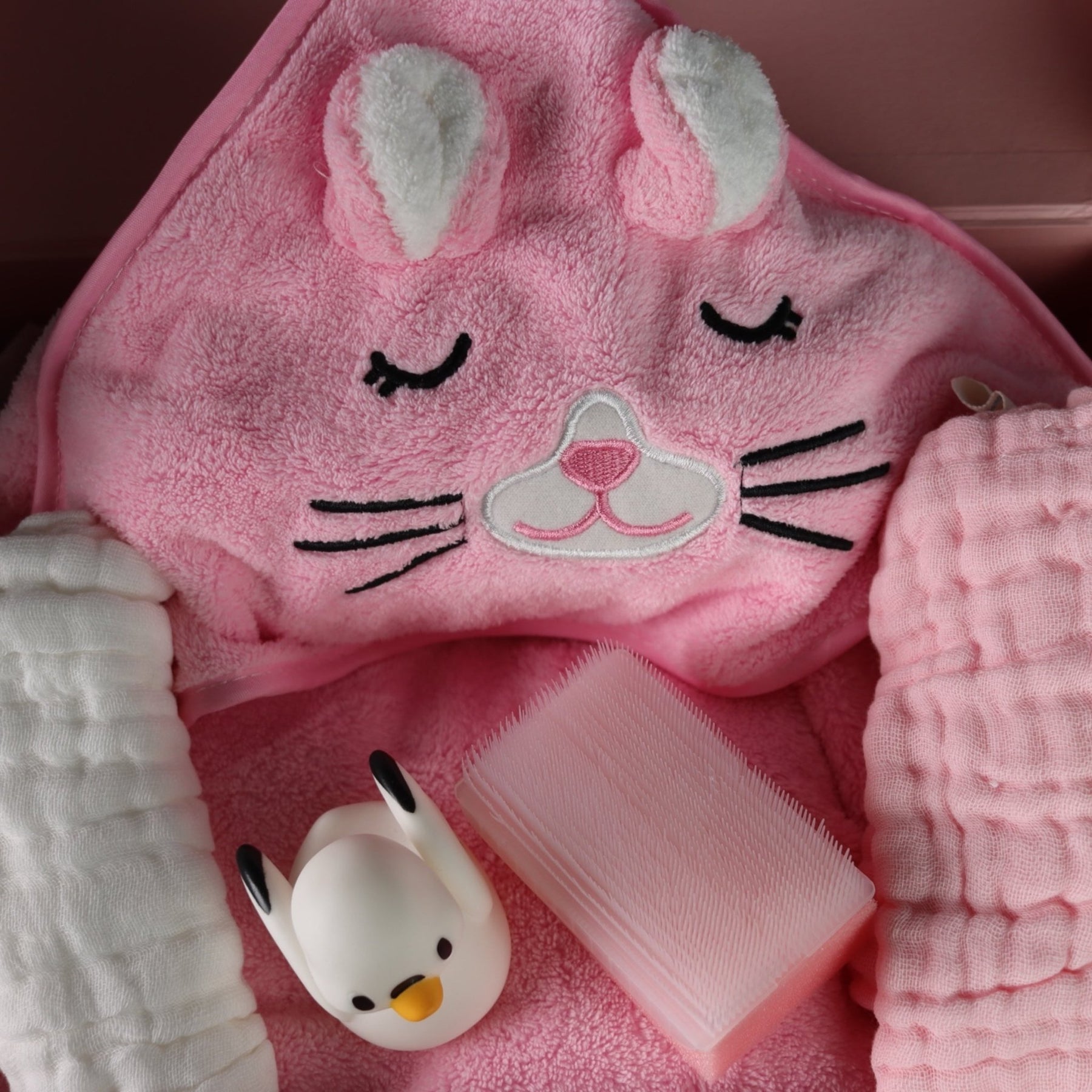 Indulge in the ultimate baby bath experience with this bath time set! It includes gentle muslim washcloths, a cozy hooded towel, a luxurious bathing scrub brush, a playful bath toy, and a soft goat bristle brush, all conveniently packaged in a charming gift box suitcase. Perfect for trips to grandma's house and ideal for storing precious keepsakes. Elevate your little one's bath routine today!