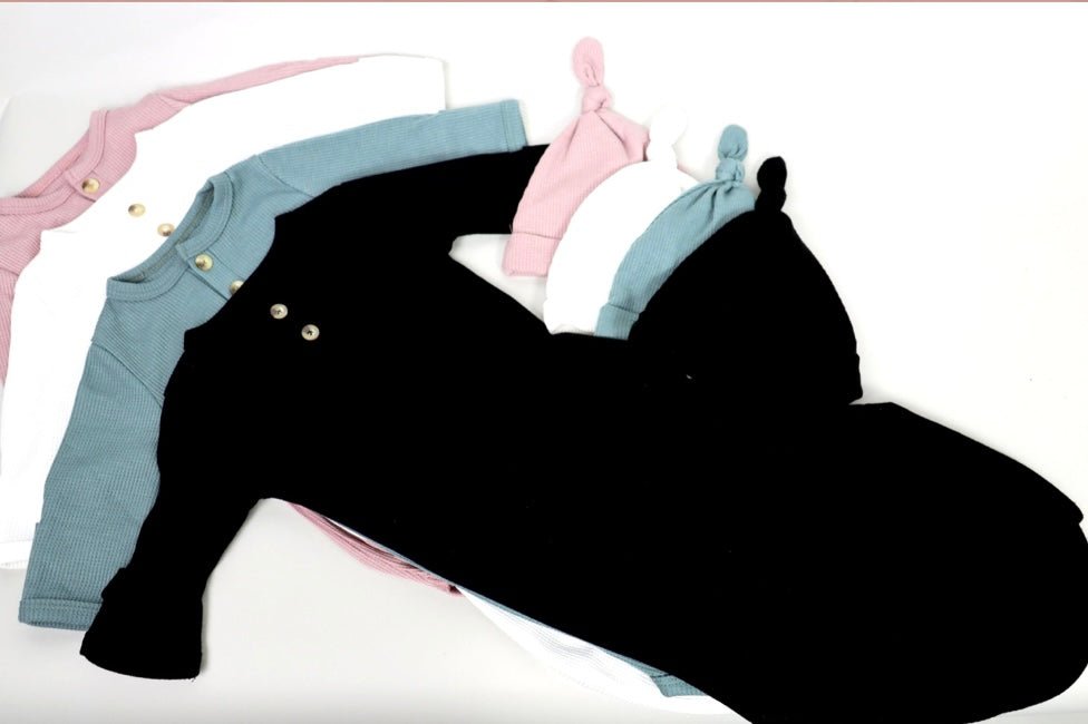 Welcome your baby with more snuggles and cuteness with our soft waffle knotted gown set. Perfect for baby announcement photos or as a thoughtful baby shower gift, this set includes a cozy waffle knot gown, a matching hat, and a wooden baby announcement sign, all beautifully packed in a keepsake suitcase. Make your baby's arrival extra special with this charming and practical newborn gift set.