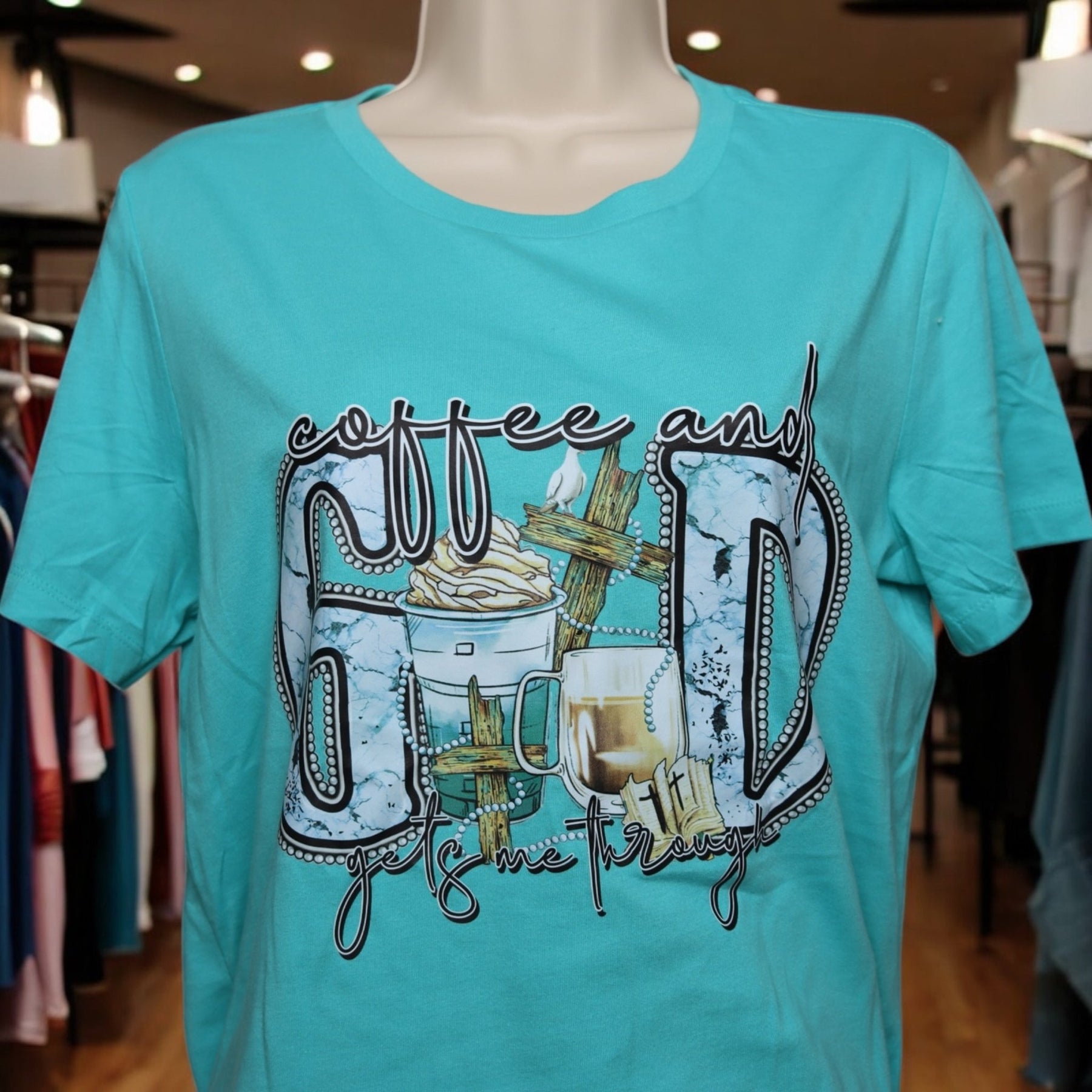 Part of our Faith Threads collection, this Coffee and God Gets Me Through tee is for the woman who runs on caffeine and Christ. Whether you’re conquering a chaotic morning or finding calm in the middle of the storm, this comfy tee reminds you of the two essentials that carry you through it all.