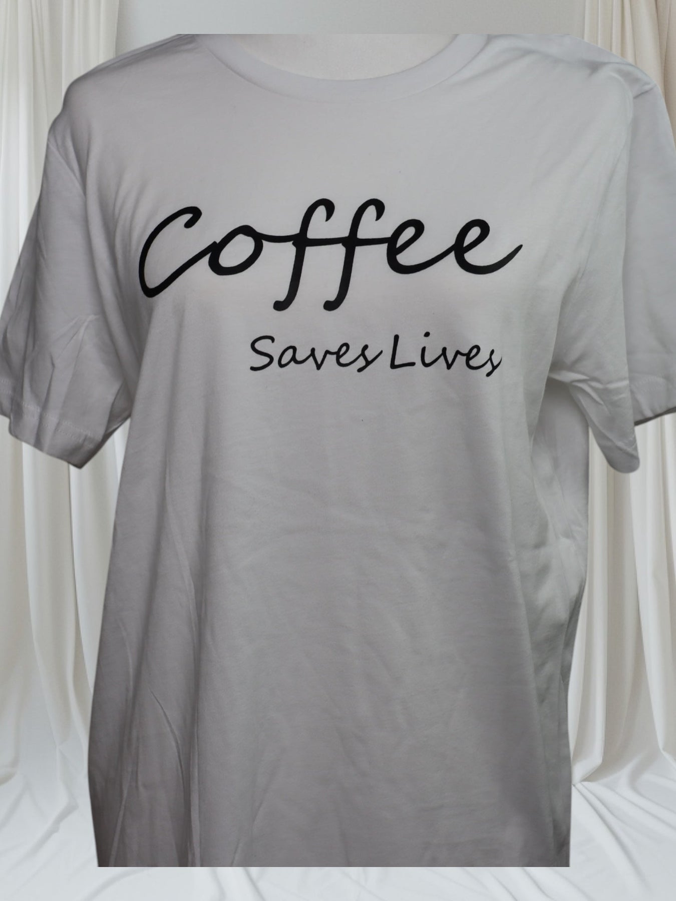 Express your love for coffee in style and comfort with this Coffee Saves Lives Tee. The bold design and essential motto make it a must-have for any coffee enthusiast. Get ready to turn heads and feel amazing with this 100% Cotton Bella + Canvas tee, available in white or black.
